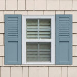 • Combo composite exterior shutters with louvers and shaker panels installed on an outdoor window.